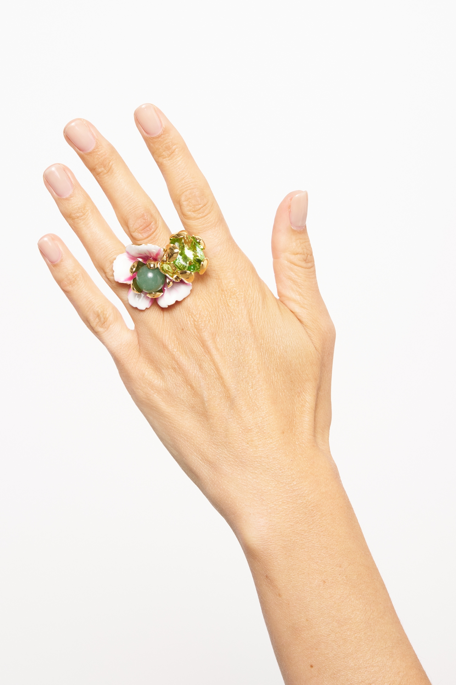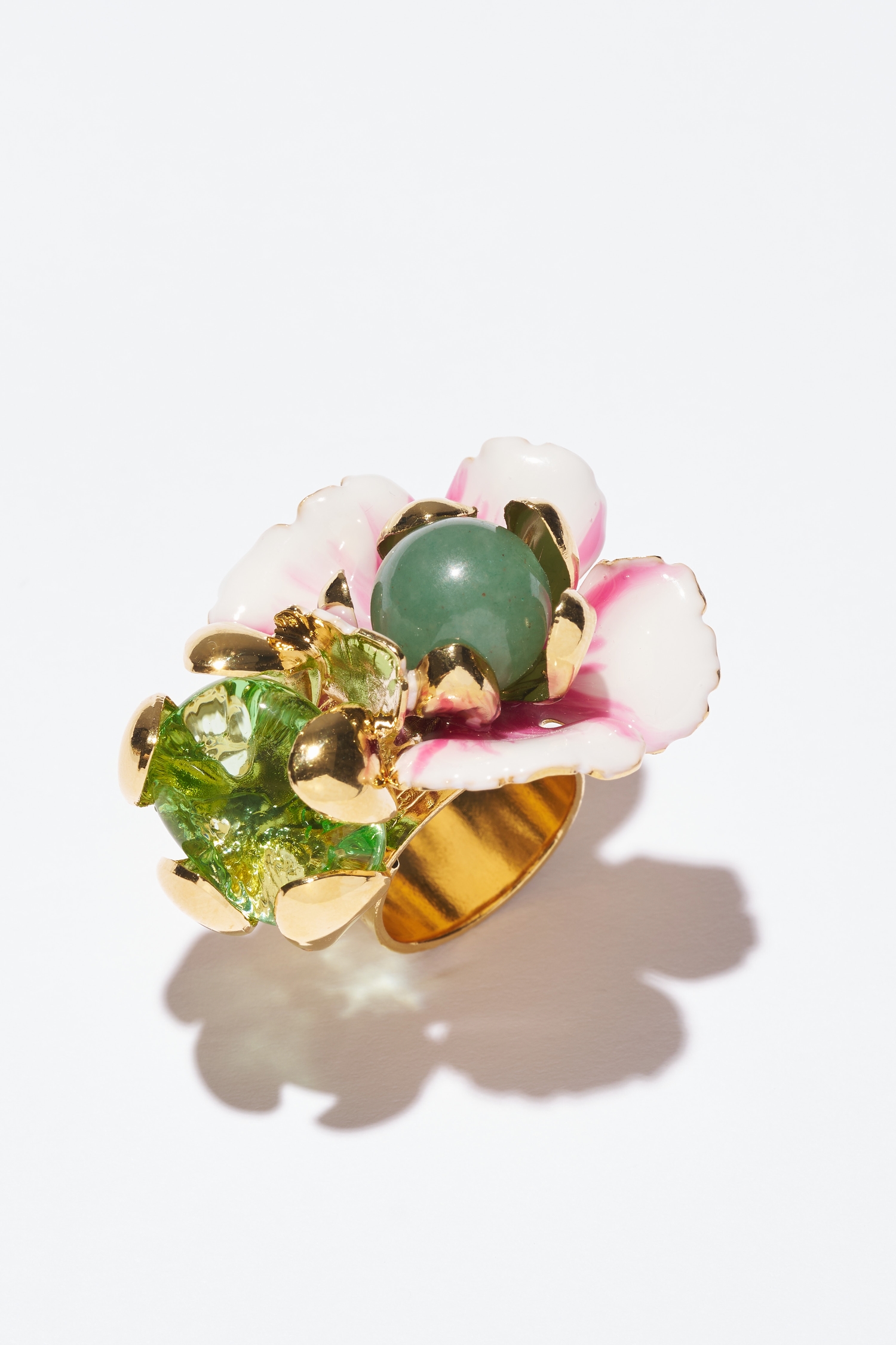 Bague ajustable femme, fleur émaillé à la main, pâte de verre.