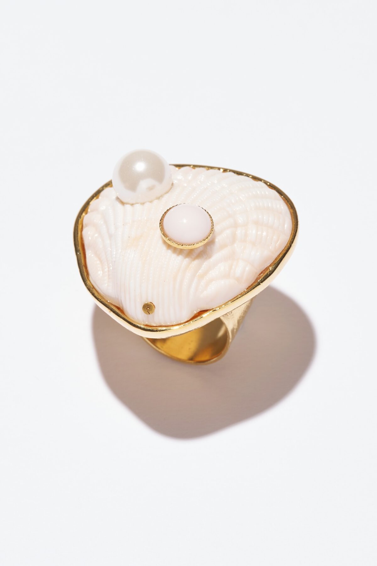 CORF 52 – Bague ajustable femme en forme de grand coquillage sur métal doré à l’or fin, sertie de perles.
