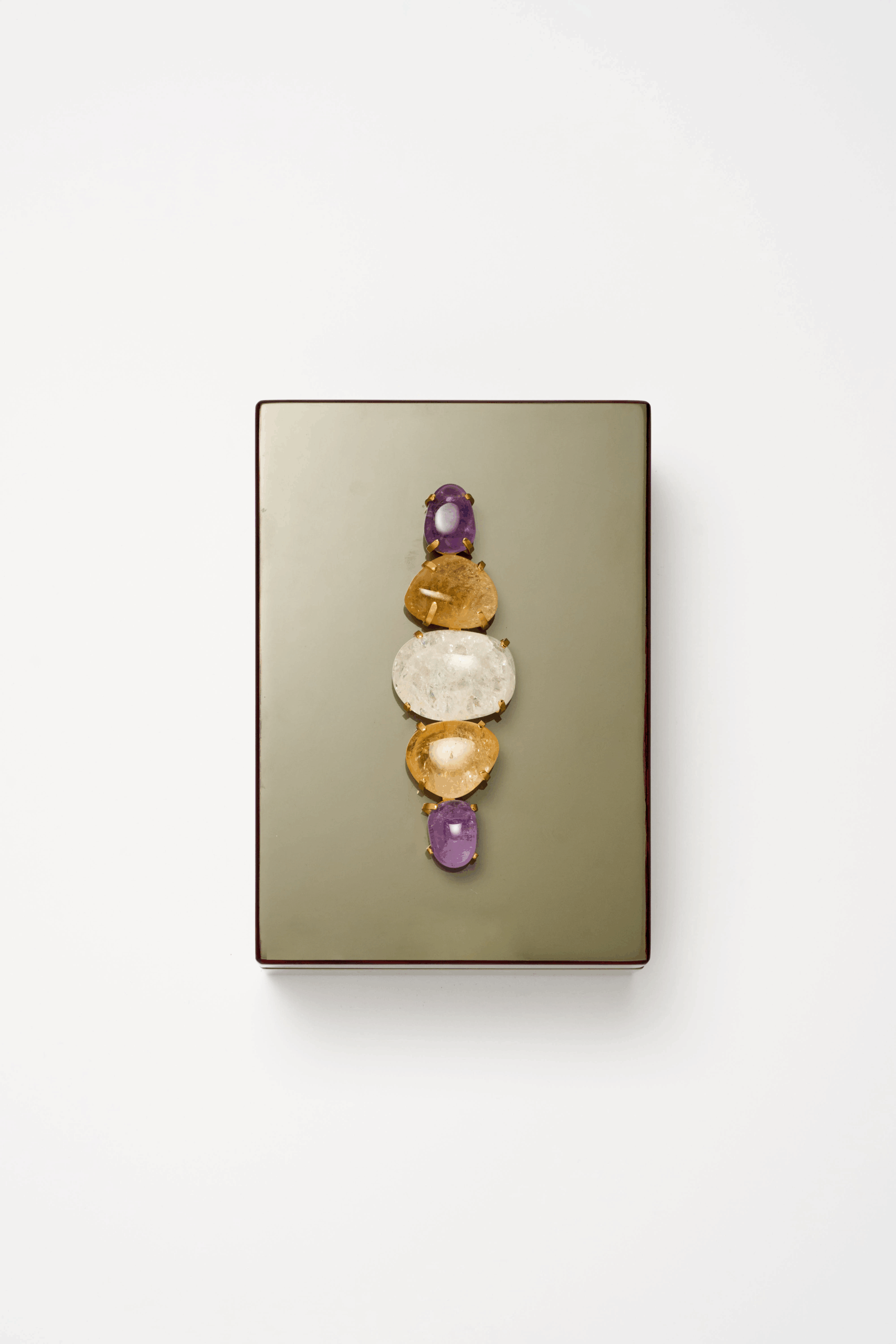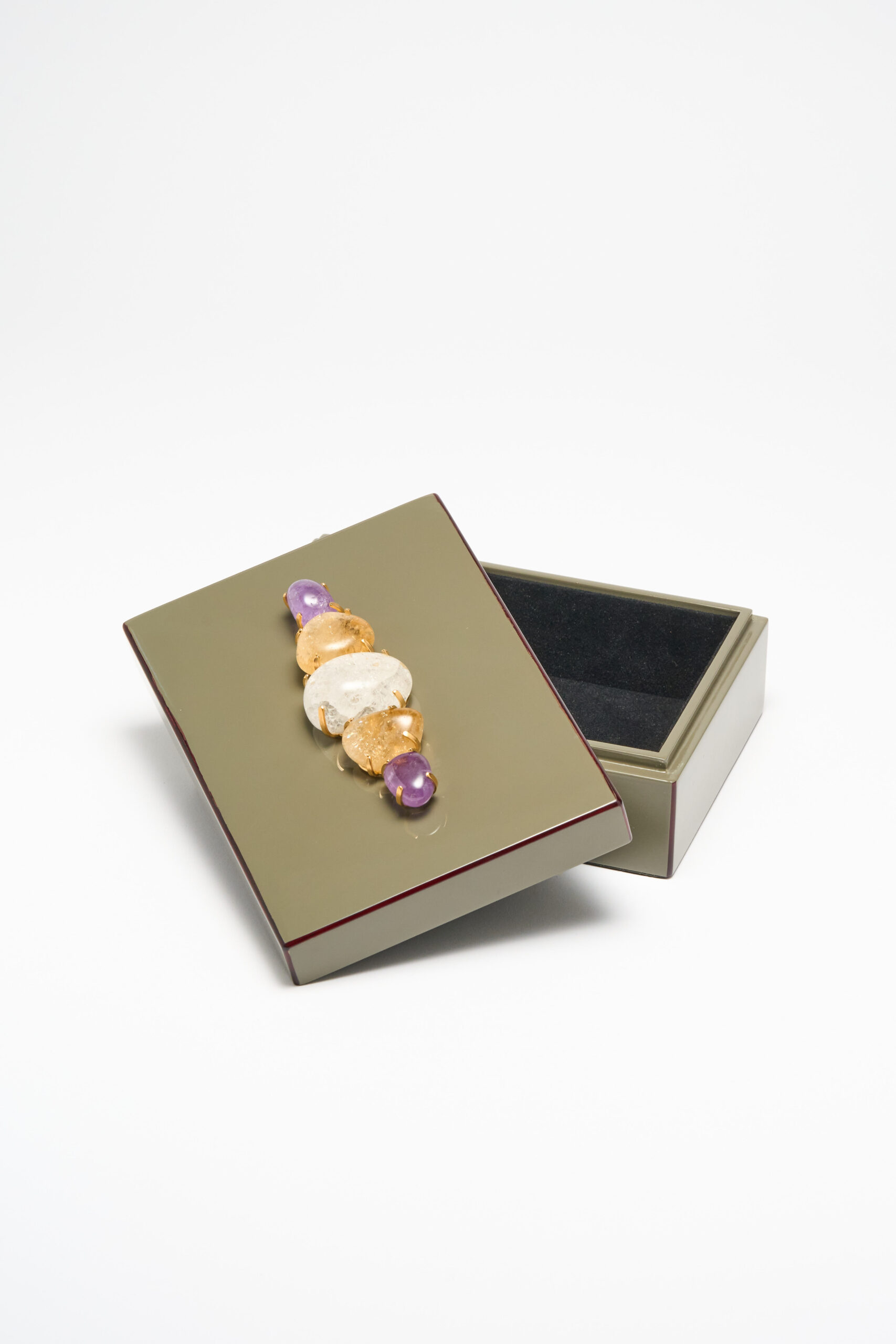 Boîte en bois laqué coloris taupe, orné d’un motif motif composé de cristal de roche, citrine naturelle et améthyste.