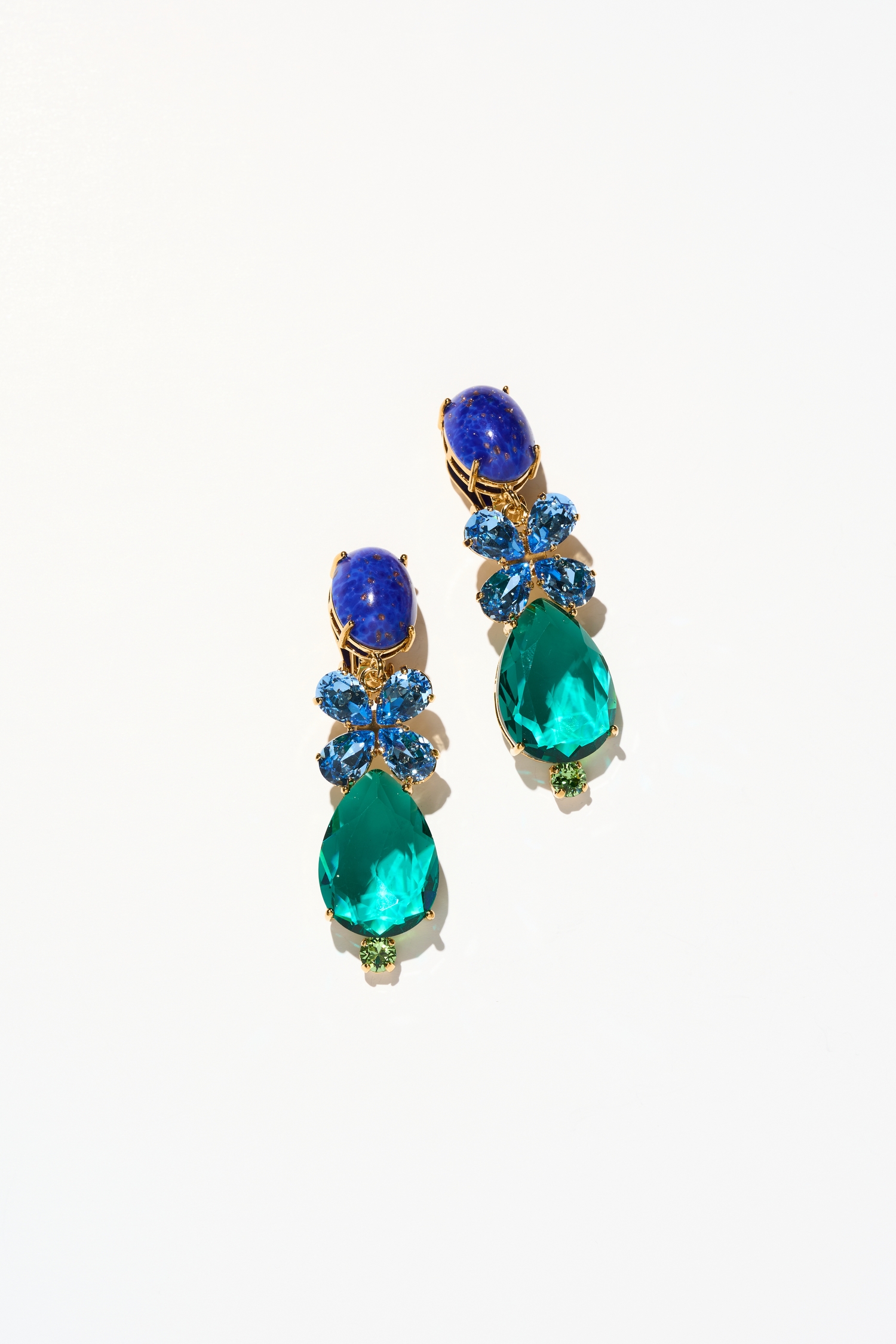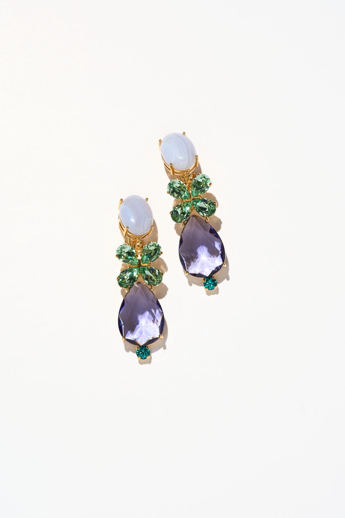 Malachites, Améthystes et Lapis-lazuli, sertis de cristaux, et rehaussés de perles sur une structure dorée à l’or fin 24 carats.