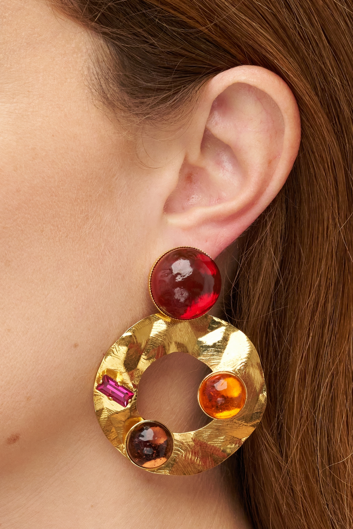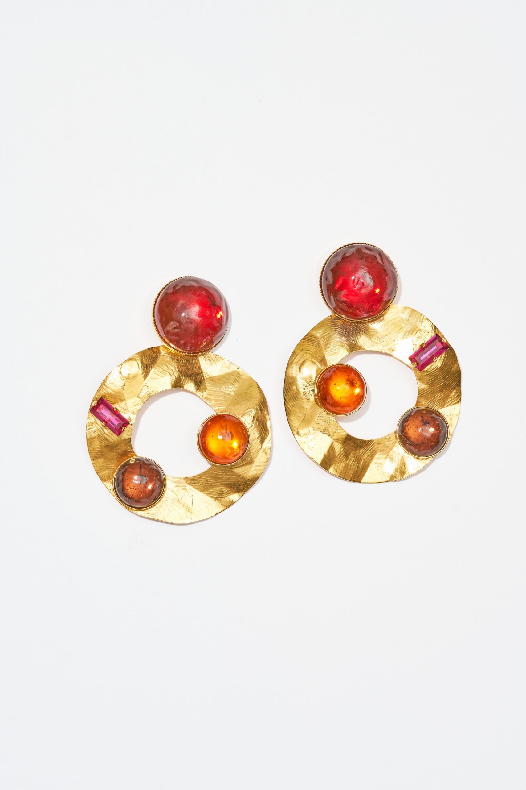 Ces boucles d’oreilles clous ETNA, structure dorée, matières en fusion, couleurs vives : le bijou se fait éruption