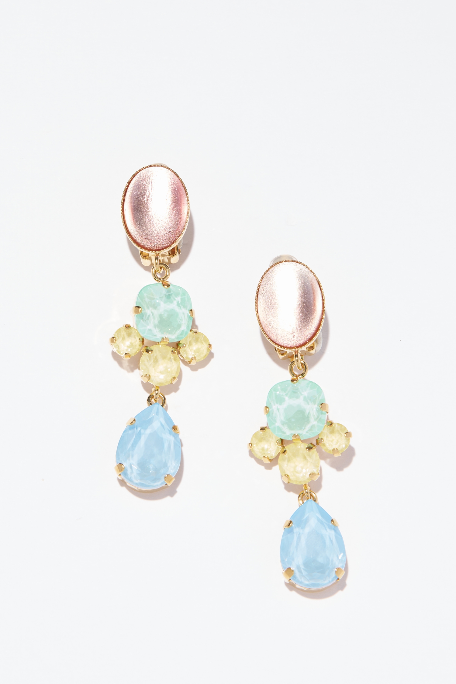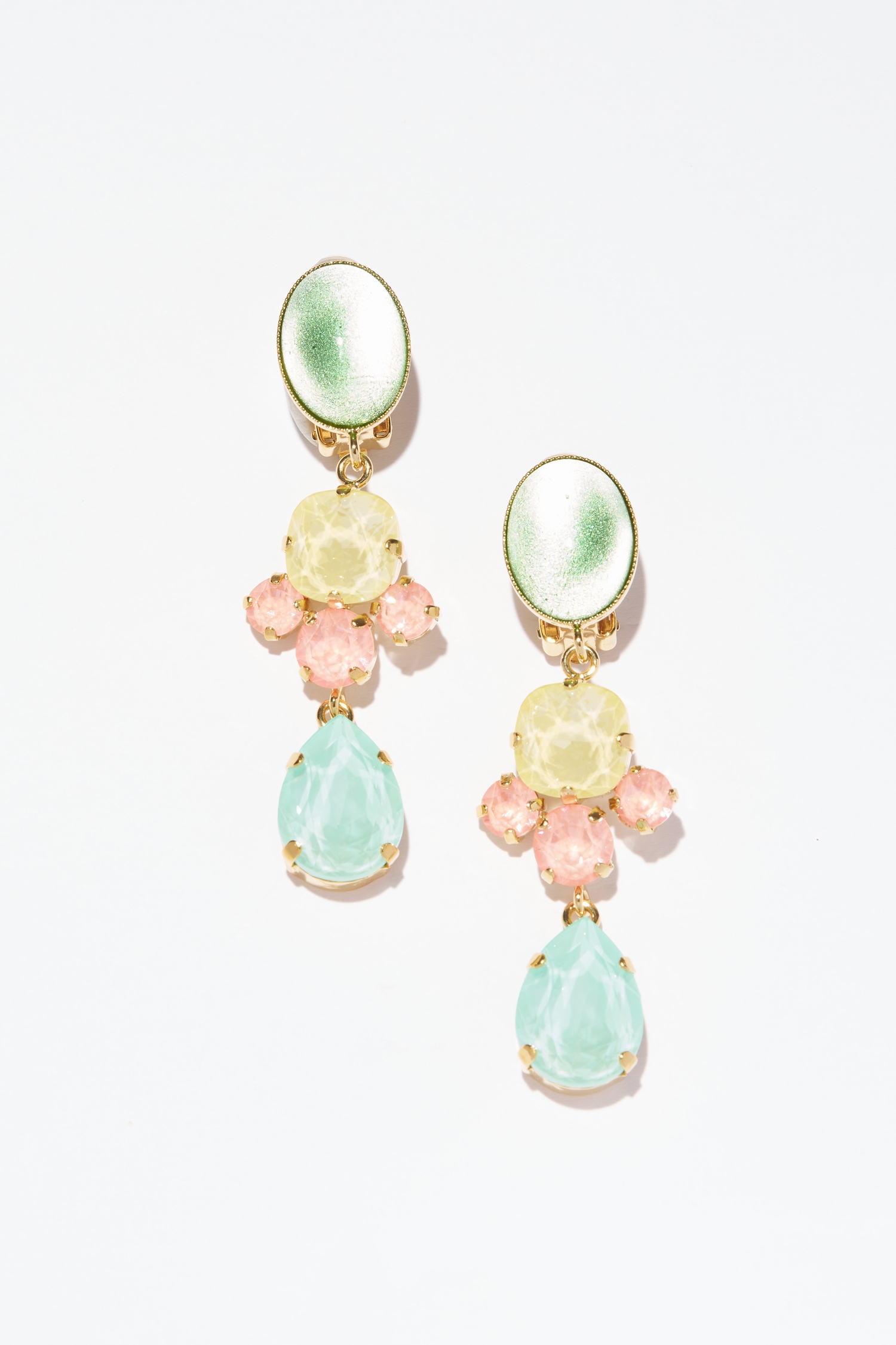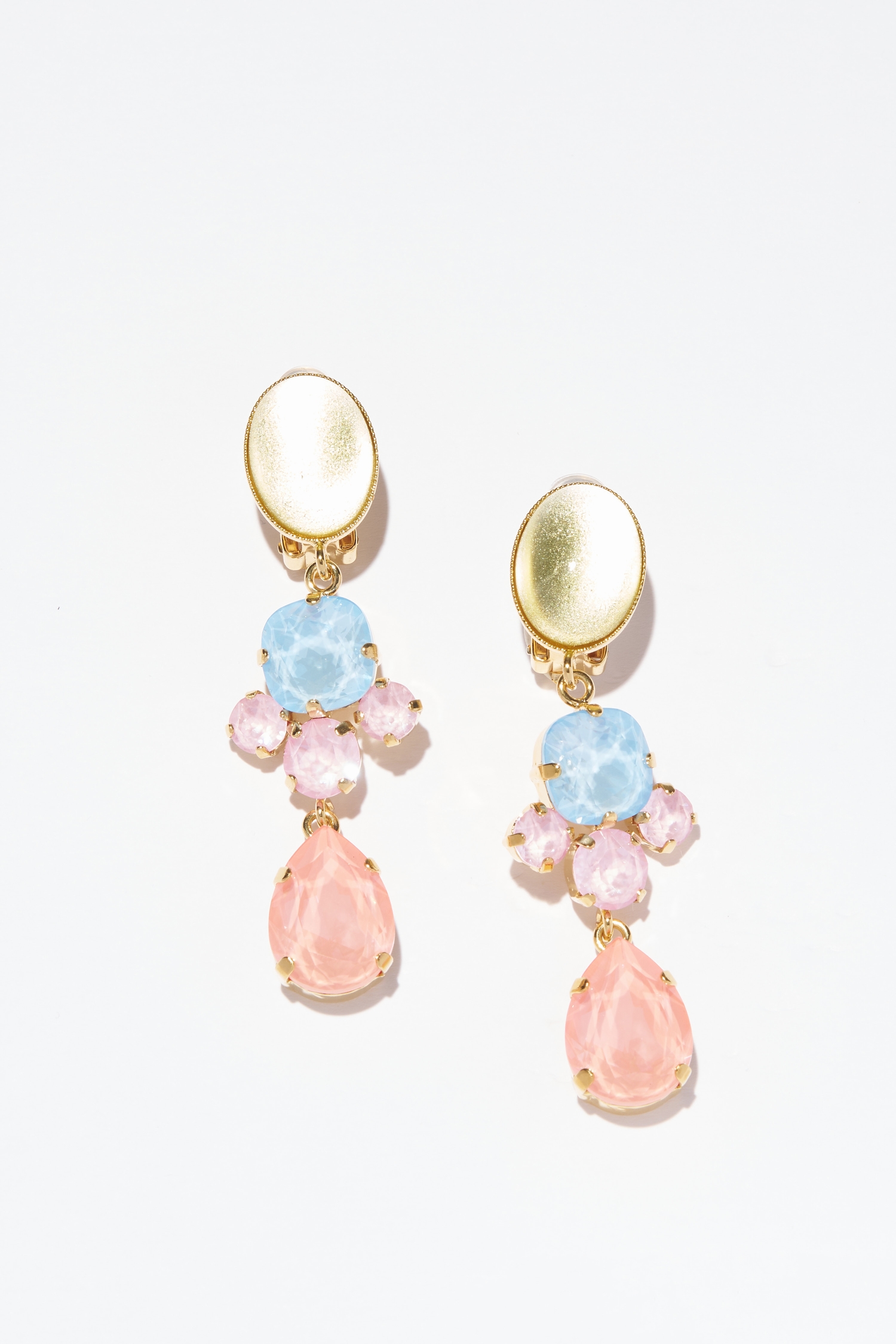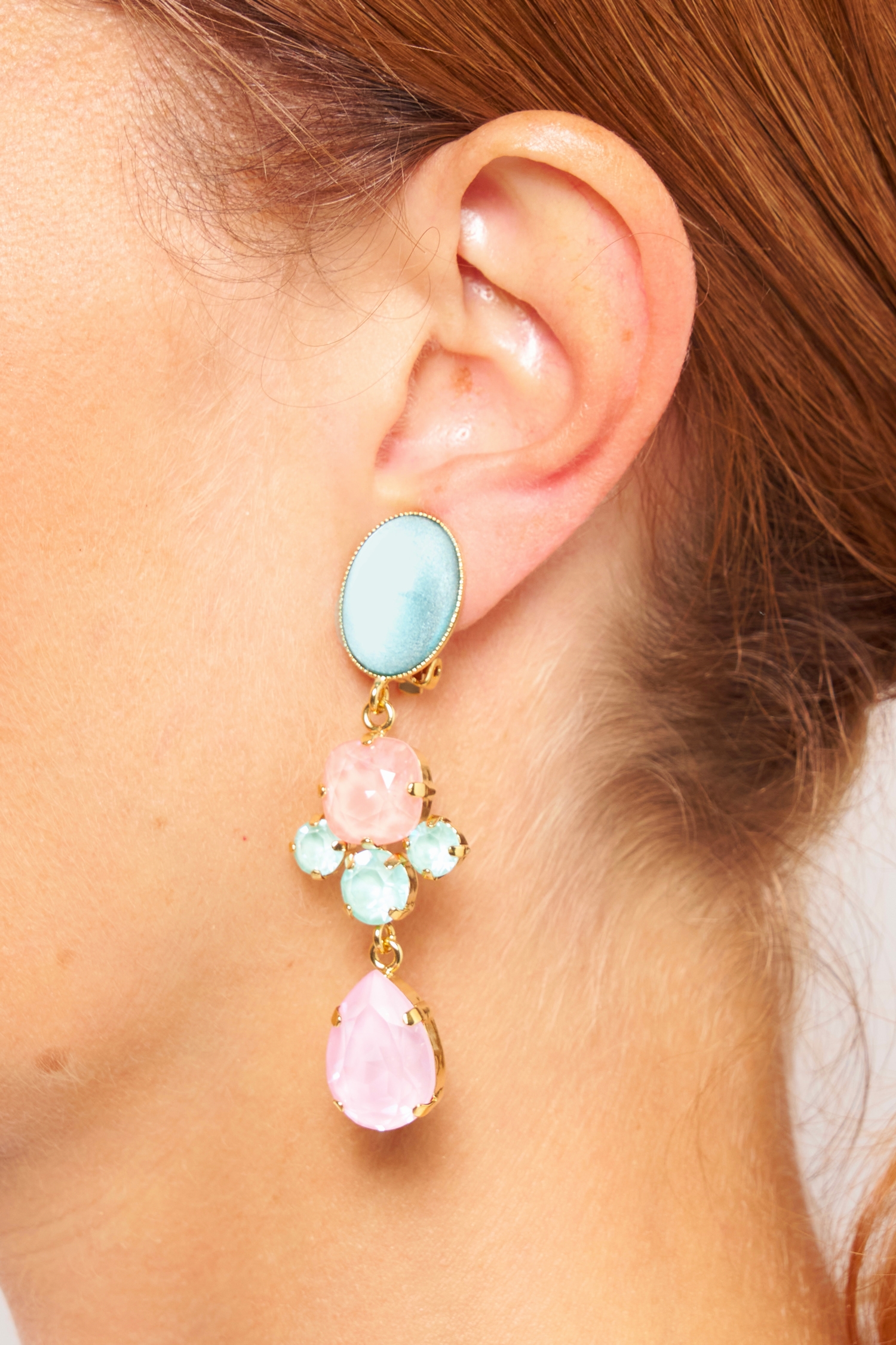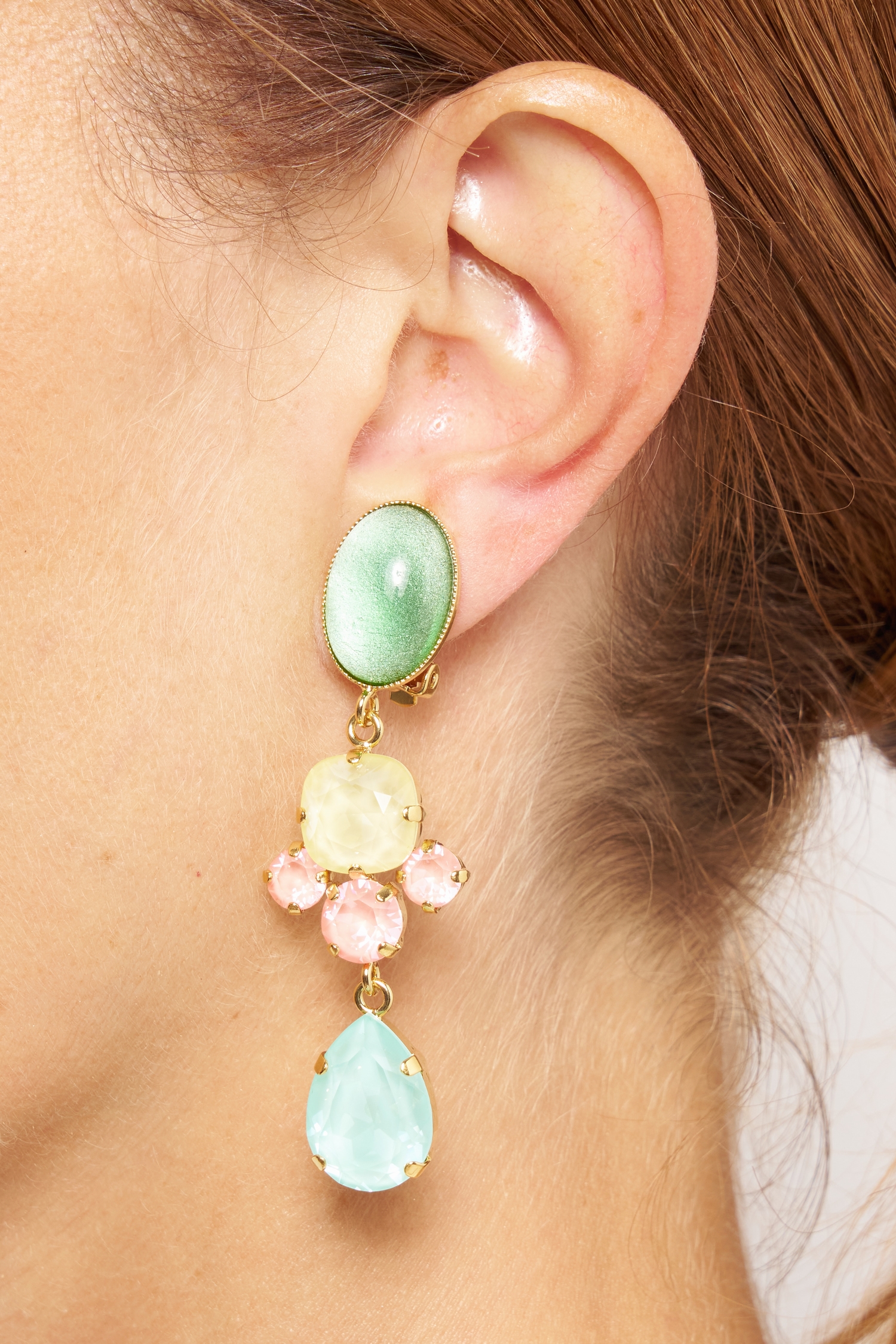 SOR 13 – Boucles d’oreilles clips raffinées aux teintes gourmandes en cristal et cabochons en verre sur laiton doré à l’or fin.