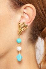 MINO 16 – Boucles d’oreilles clips longues avec perles et pierres bleues naturelles sur laiton doré à l’or fin.