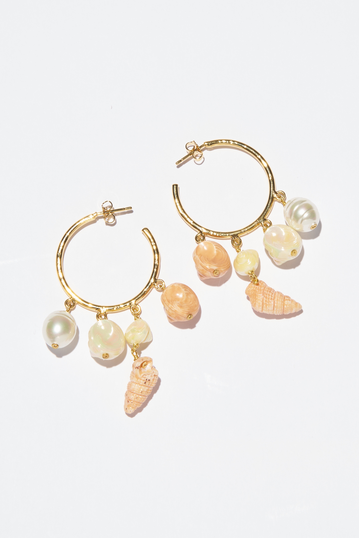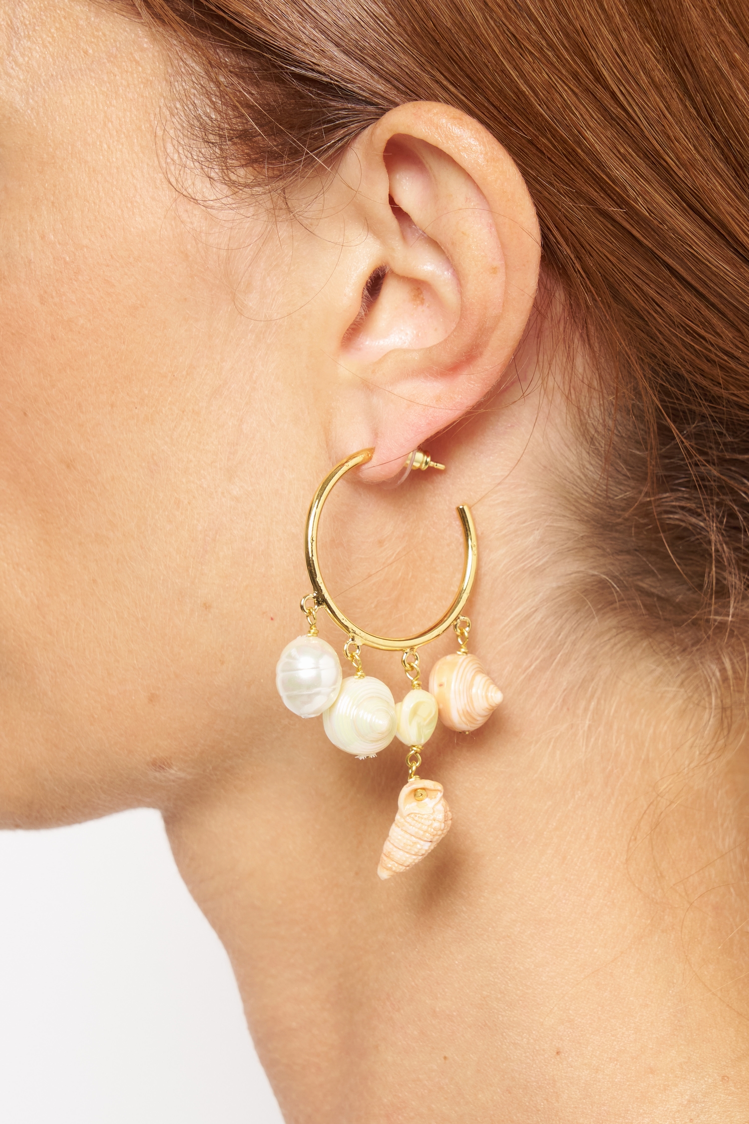 CORF 16 – Créoles clous femme en métal doré à l’or fin agrémentées de coquillages et perles d’eau douce.