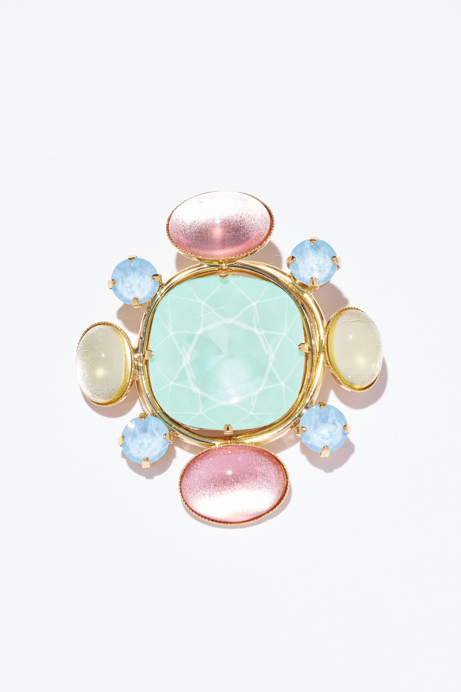 SOR 30 – Broche lumineuse en cristal Swarovski et cabochons en verre sur laiton doré à l’or fin avec crochet.