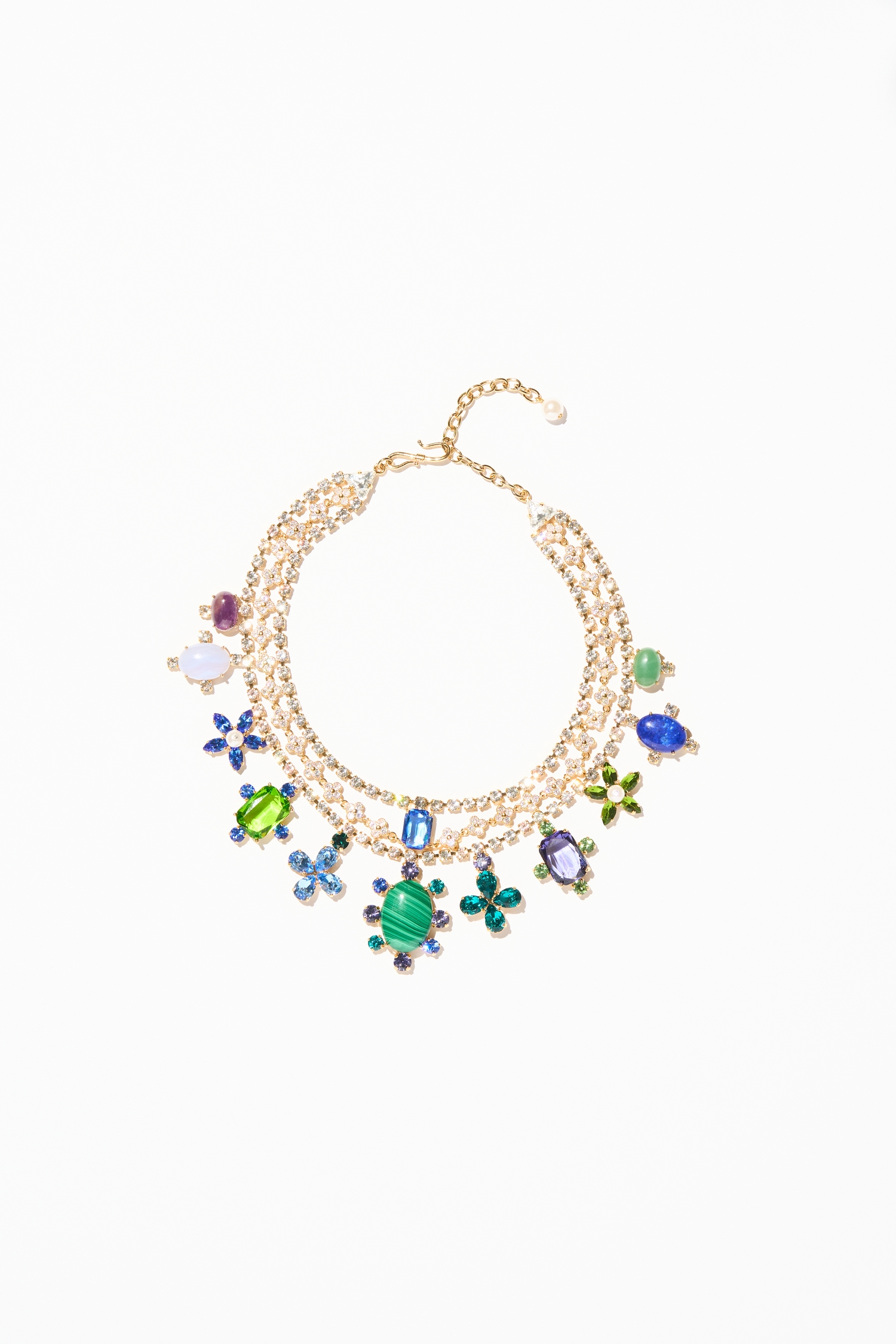 Malachites, Améthystes et Lapis-lazuli, sertis de cristaux, et rehaussés de perles sur une structure dorée à l’or fin 24 carats
