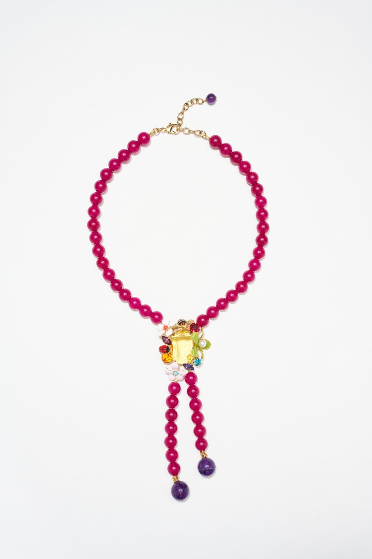 Métal : Pâte de verre facettée, fleurs de métal émaillées, cabochons, pierres de cristal facettées