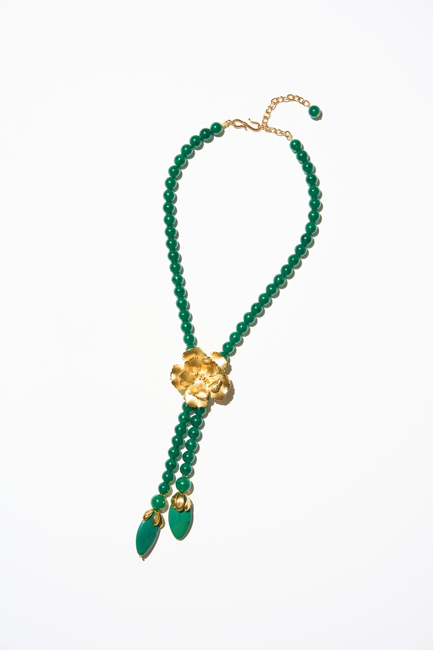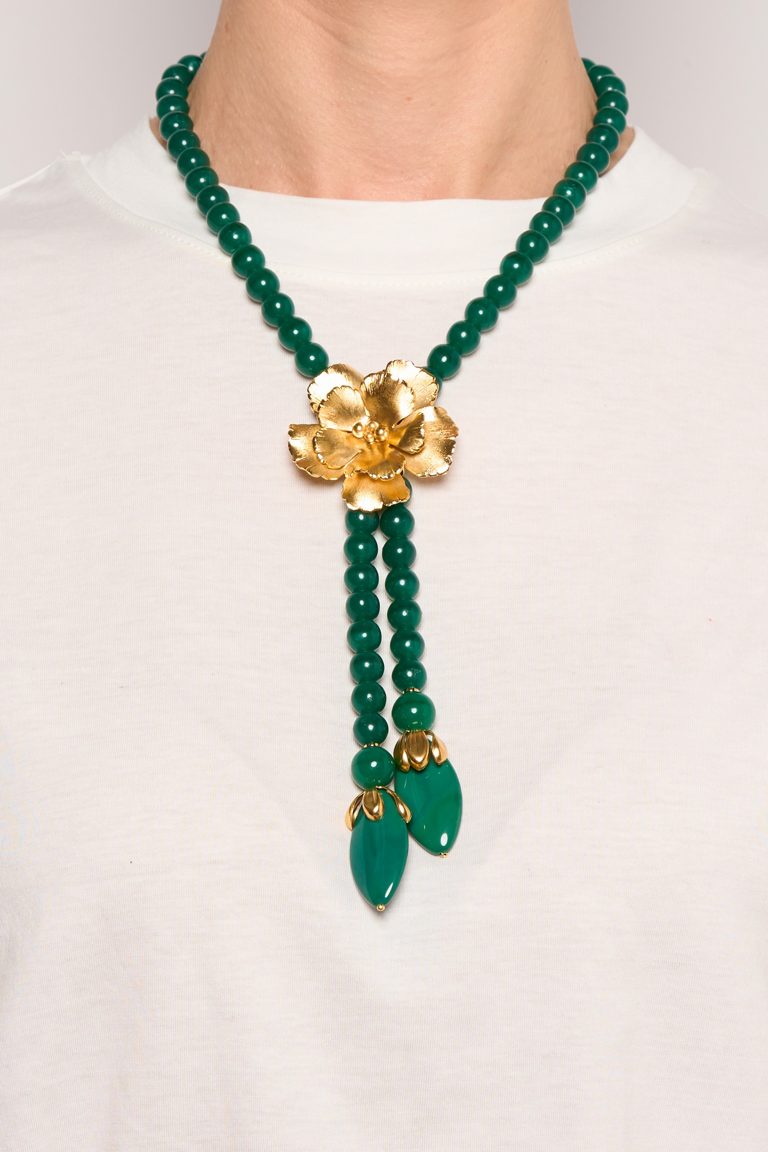 Comme un imprimé abstrait, la nature florale fond dans la matière souple et voluptueuse des perles noires et chrysoprases; le chic décontracté assumé !