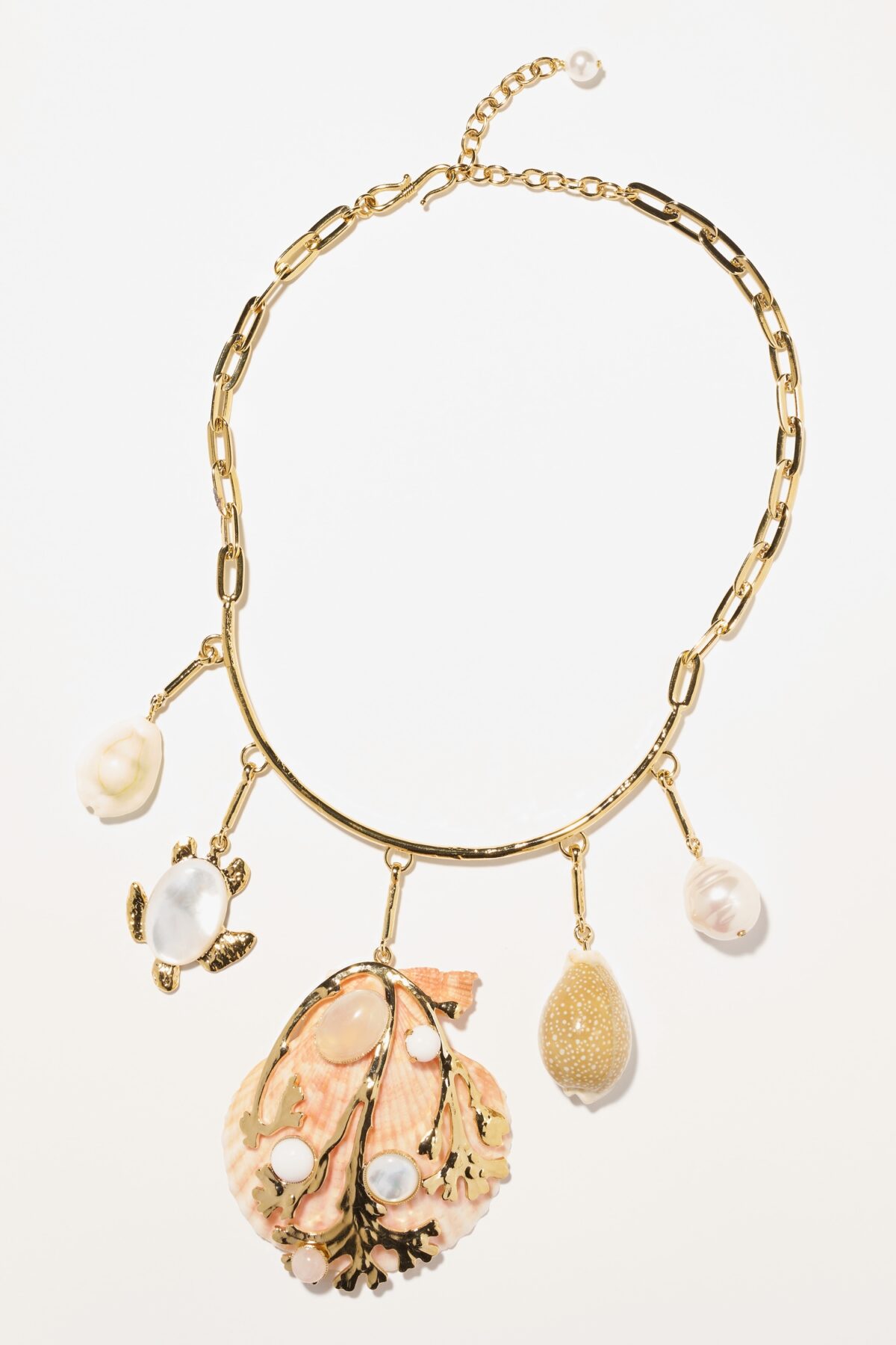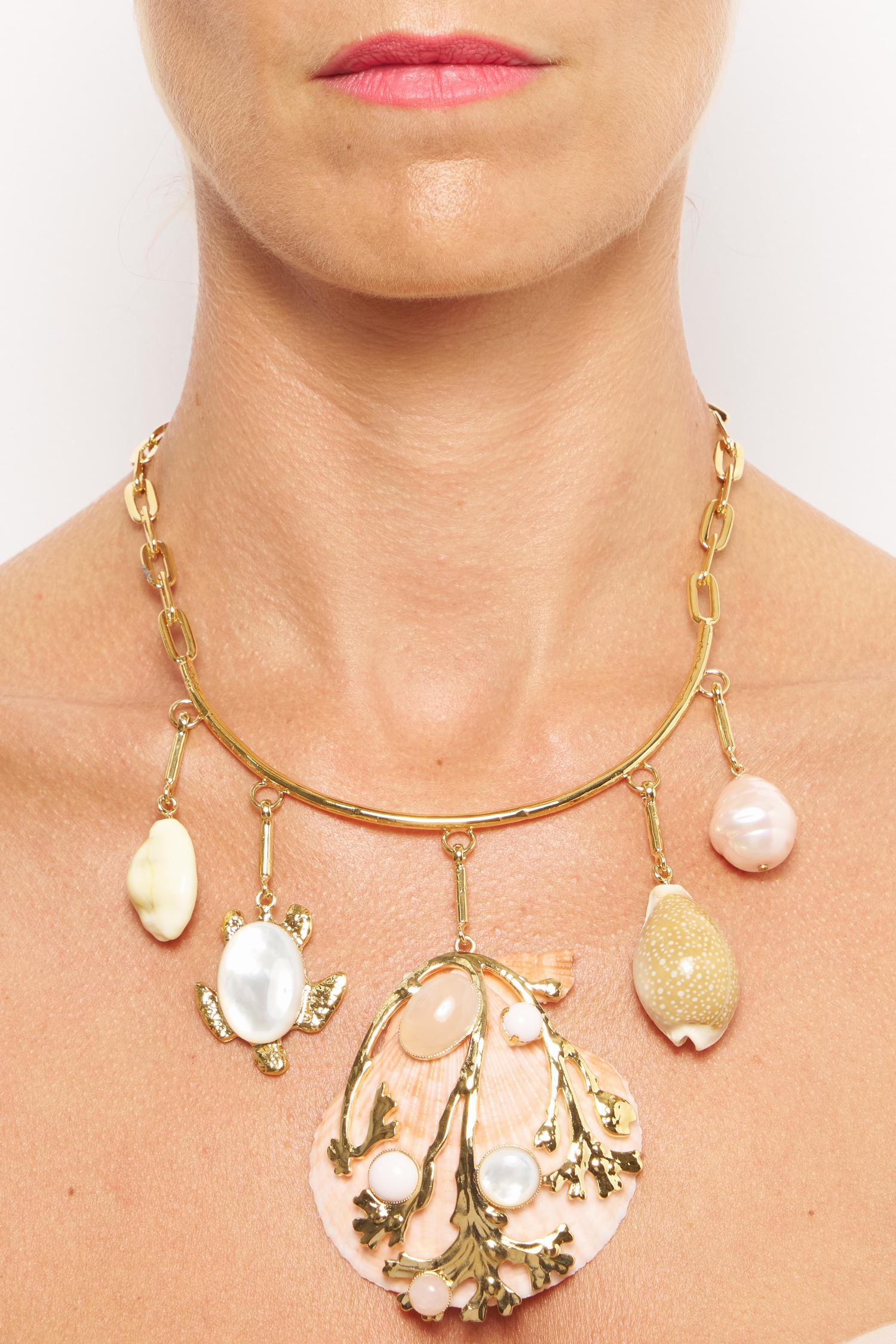 CORF 22 – Grand collier Coquillage femme, une pièce forte en métal doré à l’or fin avec multiples pampilles marines.