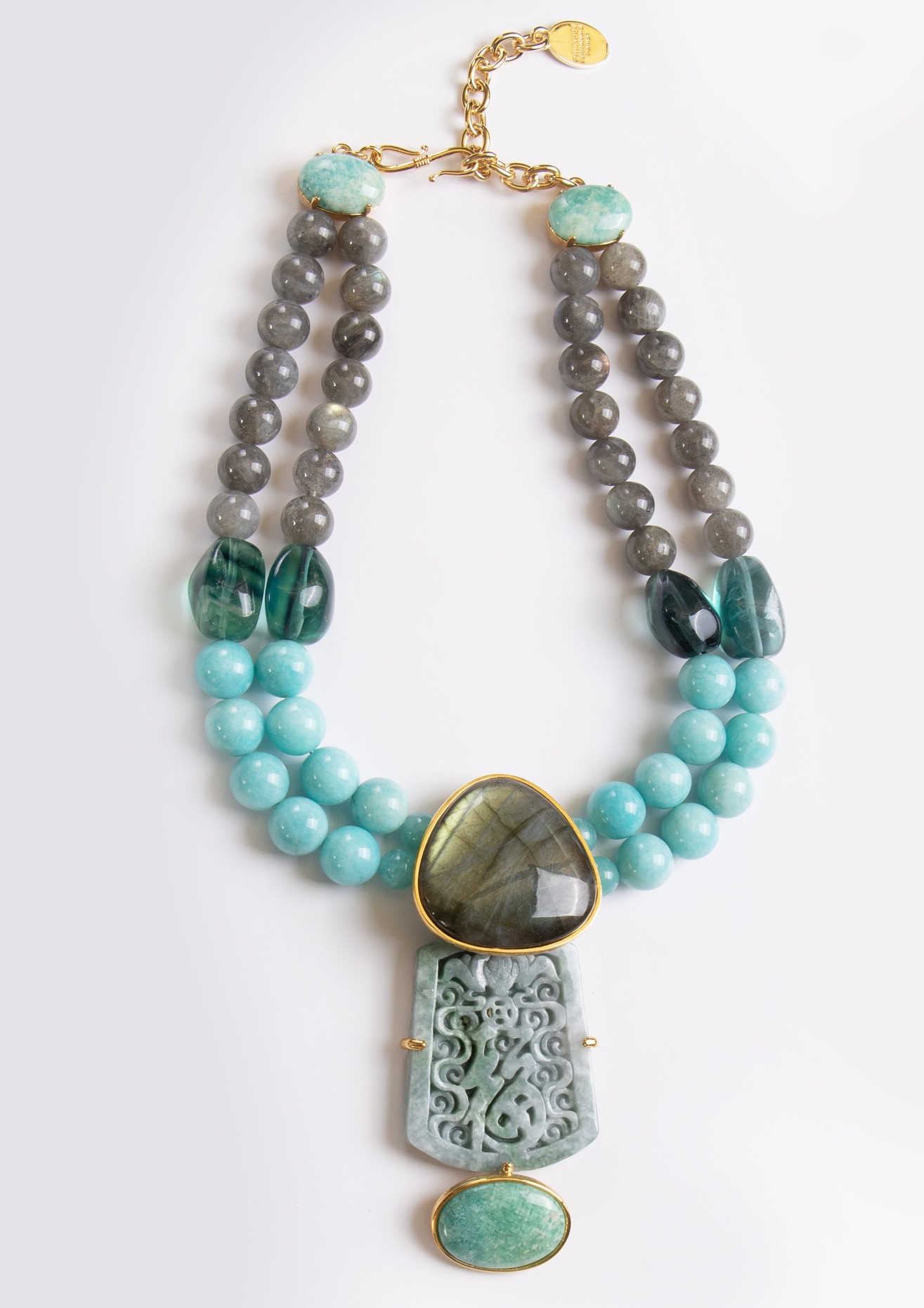 Collier pièce unique en labradorite, amazonite et jade sculpté