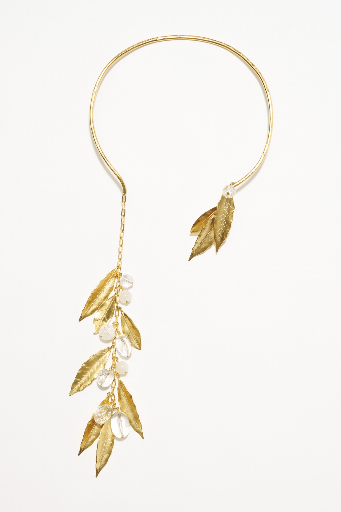 Composition : Cristal de roche, perle en pierre de lune et feuille de métal sur une structure en métal dorée à l’or 24 carats
