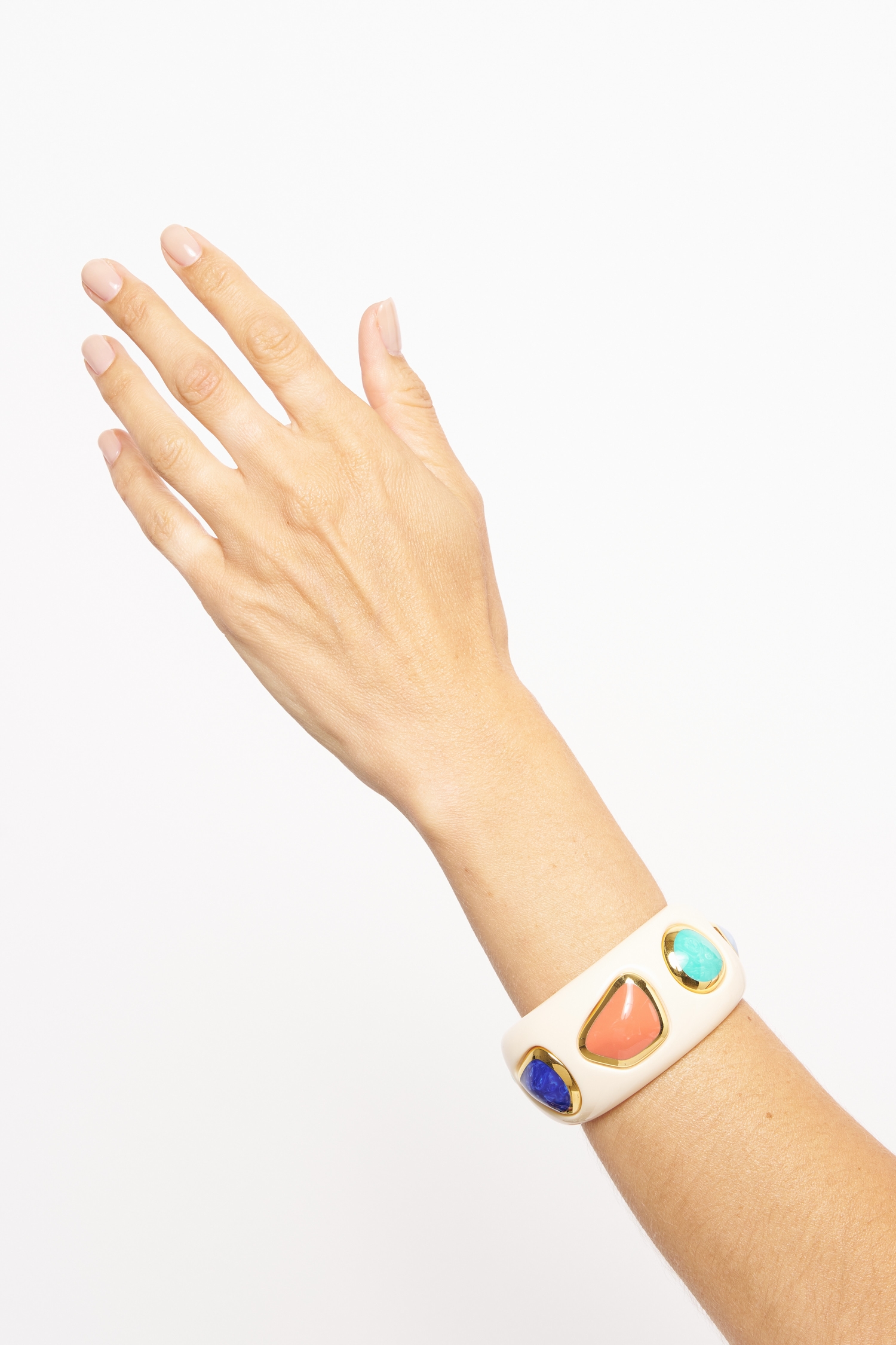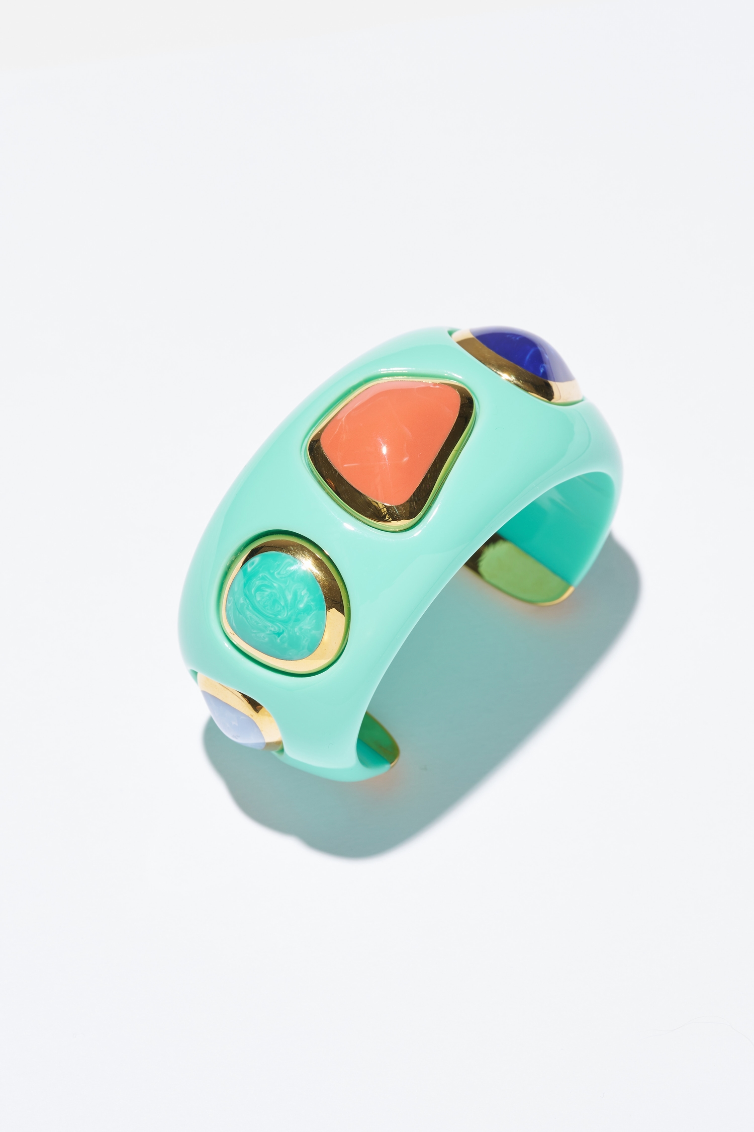Manchette Épaisse Riviera : La pièce maîtresse de la collection. Cette manchette large en résine incrustée de cabochons colorés et doré à l’or fin habille votre poignet d’un luxe artistique.