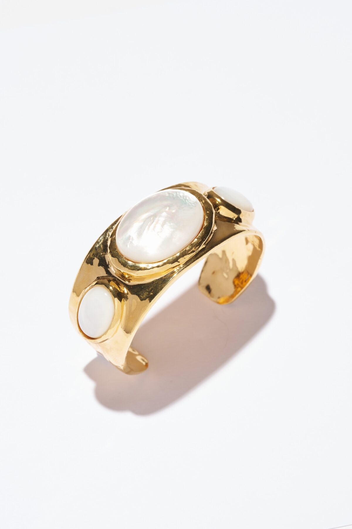 Chaque bijou met en scène une composition harmonieuse de pierres fines et ornementales – nacre, agate teintée, lapis lazuli