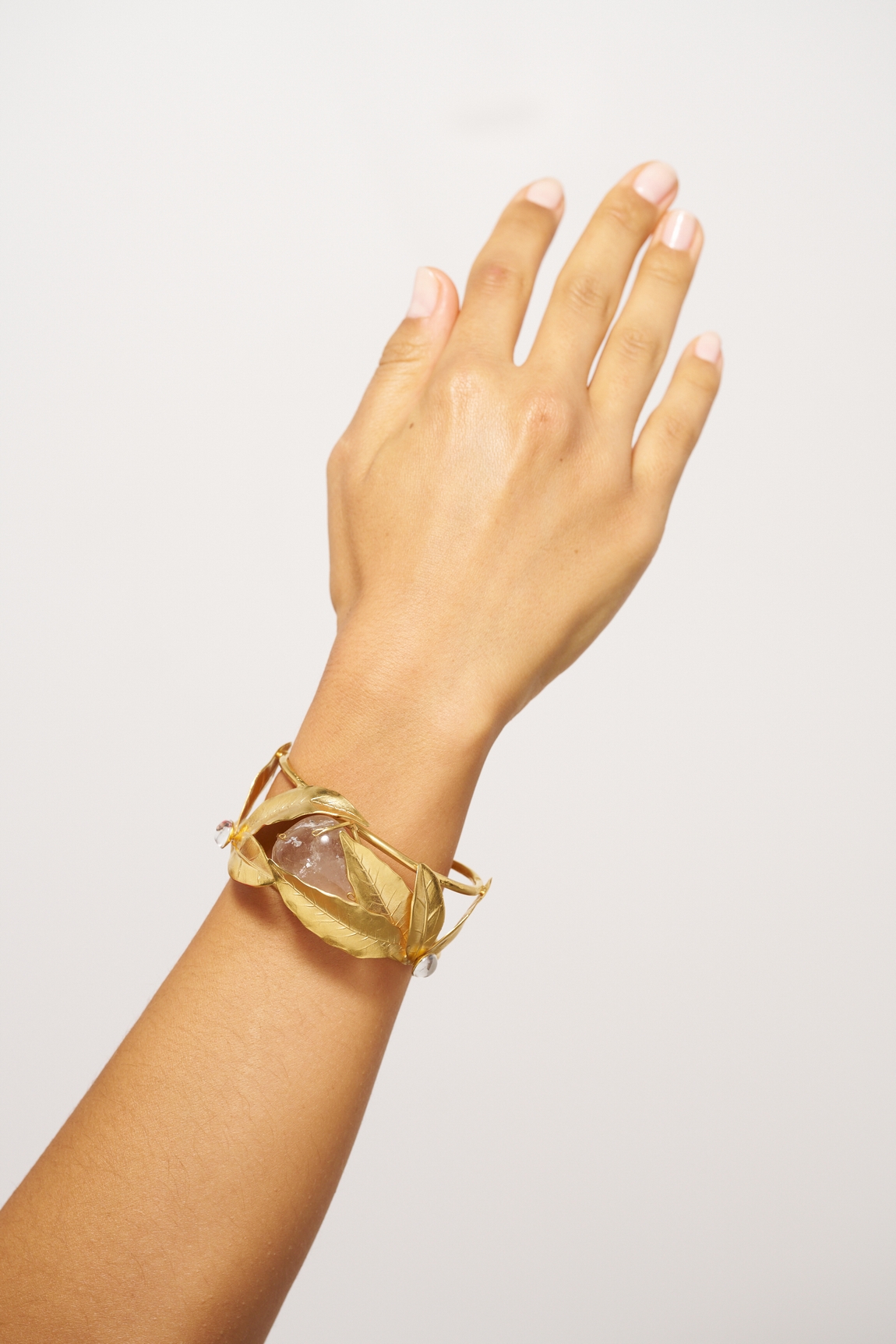 Composition : Cristal de roche, perle en pierre de lune et feuille de métal sur une structure en métal dorée à l’or 24 carats