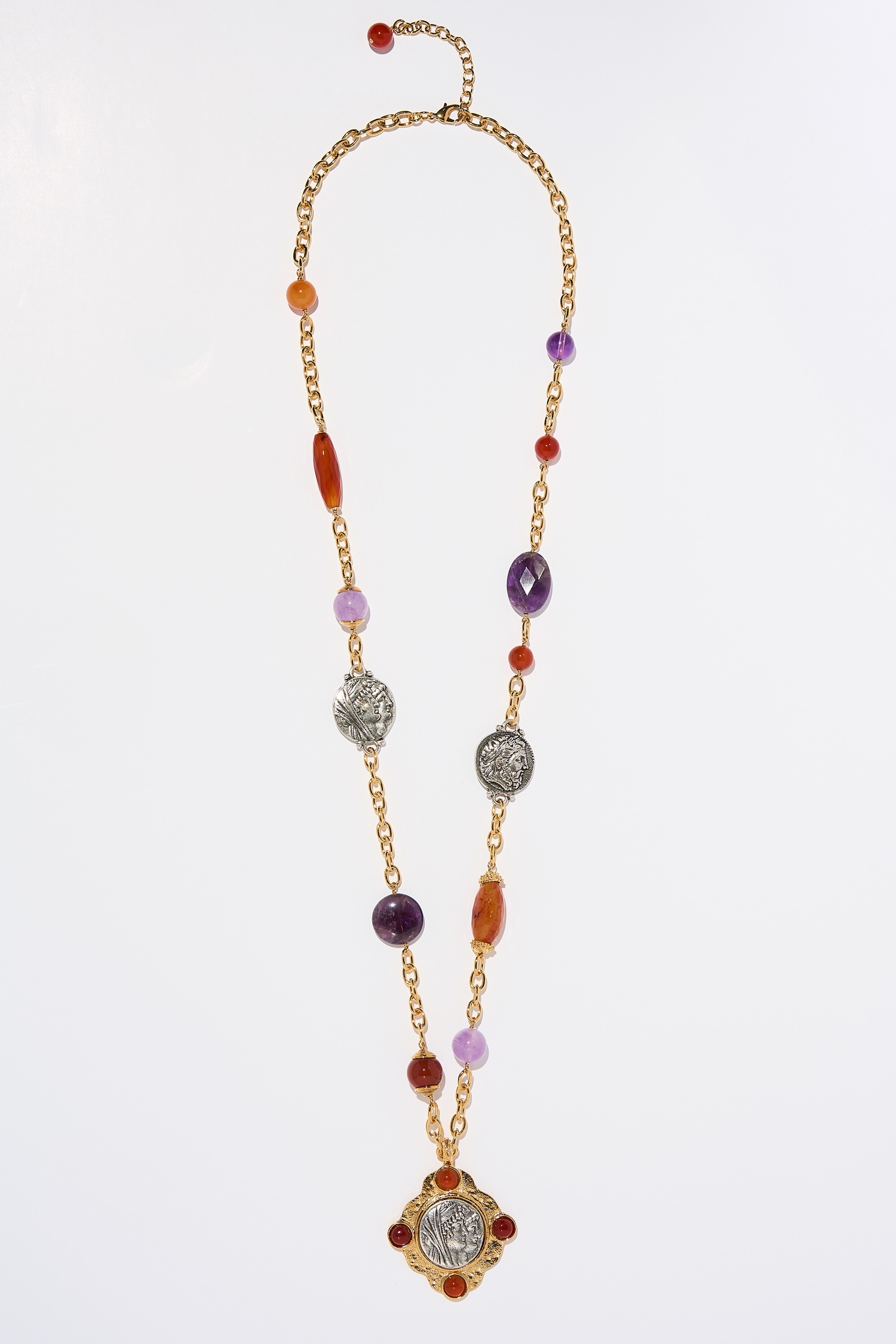 Le collier Louvre célèbre les fastes antiques avec ses cabochons couleur grenat et ses médaillons martelés.